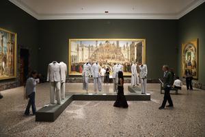 (250926) -- MILAN, 26 septiembre, 2025 (Xinhua) -- Imagen del 25 de septiembre de 2025 de personas observando creaciones exhibidas en la exposición "Giorgio Armani: Milano, per amore" en la Pinacoteca de Brera, en Milán, Italia. Más de 120 creaciones de Armani/Archivio son exhibidas entre las pinturas de la Pinacoteca de Brera desde el 24 de septiembre de 2025 hasta el 11 de enero de 2026, para honrar la trayectoria estilística del diseñador de moda italiano Giorgio Armani, fallecido el 4 de septiembre de 2025. (Xinhua/Li Jing) (oa) (ra)
