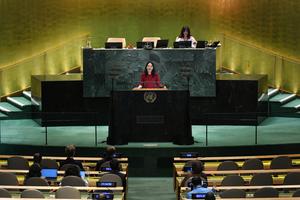 (250929) -- NACIONES UNIDAS, 29 septiembre, 2025 (Xinhua) -- Annalena Baerbock, presidenta del 80º período de sesiones de la Asamblea General de las Naciones Unidas (AGNU), realiza declaraciones de clausura durante el Debate General del 80º período de sesiones de la AGNU, en la sede de la Organización de las Naciones Unidas, en Nueva York, el 29 de septiembre de 2025. El Debate General del 80° período de sesiones de la AGNU concluyó el lunes. (Xinhua/Li Rui) (rtg) (ah) (ce)