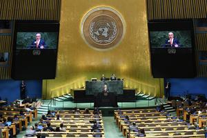(250926) -- NACIONES UNIDAS, 26 septiembre, 2025 (Xinhua) -- El primer ministro israelí, Benjamin Netanyahu, pronuncia un discurso durante el debate general del 80º período de sesiones de la Asamblea General de las Naciones Unidas, en la sede de la ONU, en Nueva York, el 26 de septiembre de 2025. (Xinhua/Li Rui) (oa) (ra) (ce)