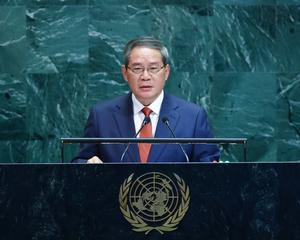 (250926) -- NACIONES UNIDAS, 26 septiembre, 2025 (Xinhua) -- El primer ministro chino, Li Qiang, pronuncia un discurso en el debate general del 80° período de sesiones de la Asamblea General de las Naciones Unidas, en la sede de la ONU, en Nueva York, el 26 de septiembre de 2025. (Xinhua/Liu Bin) (jg) (rtg) (ce)