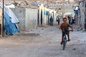 (250929) -- CAMPAMENTOS DE KARAMA, 29 septiembre, 2025 (Xinhua) -- Imagen del 25 de septiembre de 2025 de un niño circulando en una bicicleta en los campamentos de Karama, en la provincia de Idlib, en el noroeste de Siria. En las rocosas colinas del norte de Idlib, cerca de la frontera turca, los campamentos de Karama se extienden como una ciudad de desplazados. (Xinhua/Str) (oa) (ah) (vf)