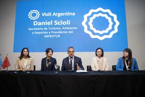 (250930) — BUENOS AIRES, 30 septiembre, 2025 (Xinhua) — (De izq. a der.) Imagen del 29 de septiembre de 2025 de Laura Teruel, presidenta de la Cámara Argentina de Turismo, Hao Qing, gerente de ventas del departamento de viajes receptivos de China International Travel Service Limited, Daniel Scioli, secretario de Turismo, Ambiente y Deportes de Argentina y presidente del Instituto Nacional de Promoción Turística, Jin Wenmo, gerente general de China Energy International Group y miembro de la comisión directiva de la Cámara Argentino China de la Producción, la Industria y el Comercio (Cacpic), y Estefanía Rouco, responsable del área de socios y comunicación de la Cacpic, participando durante el evento “Claves para recibir al viajero chino: promoción y hospitalidad”, en el marco de la Feria Internacional de Turismo de América Latina (FIT) 2025, en el predio Ferial La Rural, en la ciudad de Buenos Aires, capital de Argentina. El auge del turismo emisor en China marcó la agenda de un concurrido encuentro celebrado el lunes en la FIT 2025 en Buenos Aires, donde funcionarios y especialistas debatieron sobre las oportunidades y desafíos para captar a un público cada vez más interesado en destinos lejanos como Argentina. (Xinhua/Martín Zabala) (mz) (jg) (ra) (vf)