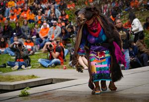 (251001) -- VANCOUVER, 1 octubre, 2025 (Xinhua) -- Imagen del 30 de septiembre de 2025 de una mujer portando un traje indígena mientras baila en un evento conmemorativo del Día Nacional de la Verdad y la Reconciliación, en la Universidad de Columbia Británica, en Vancouver, Columbia Británica, Canadá. Canadá celebró el martes el Día Nacional de la Verdad y la Reconciliación, también conocido como el Día de la Camisa Naranja, para conmemorar la trágica historia de las escuelas residenciales para indígenas y reflexionar sobre sus impactos duraderos en los sobrevivientes, sus familias y comunidades. (Xinhua/Liang Sen) (jg) (ra) (ce)