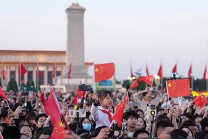 (251001) -- BEIJING, 1 octubre, 2025 (Xinhua) -- Personas asisten a una ceremonia de izamiento de la bandera para conmemorar el 76º aniversario de la fundación de la República Popular China en la Plaza Tian'anmen, en Beijing, capital de China, el 1 de octubre de 2025. (Xinhua/Ju Huanzong) (jg) (ra) (vf)