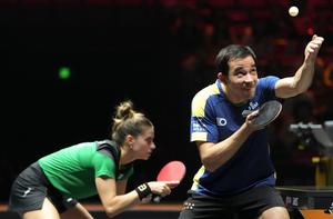 (240930) -- BEIJING, 30 septiembre, 2025 (Xinhua) -- Hugo Calderano (d)/Bruna Takahashi de Brasil, sirven la pelota durante el partido de octavos de final de dobles mixtos entre Xue Fei/Qian Tianyi, de China, y Hugo Calderano/Bruna Takahashi, de Brasil, en el China Smash del World Table Tennis (WTT) 2025, en Beijing, China, el 30 de septiembre de 2025. (Xinhua/Sun Fei) (oa) (ah) (vf)