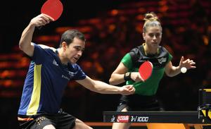 (240930) -- BEIJING, 30 septiembre, 2025 (Xinhua) -- Hugo Calderano (i)/Bruna Takahashi de Brasil, compiten durante el partido de octavos de final de dobles mixtos entre Xue Fei/Qian Tianyi, de China, y Hugo Calderano/Bruna Takahashi, de Brasil, en el China Smash del World Table Tennis (WTT) 2025, en Beijing, China, el 30 de septiembre de 2025. (Xinhua/Sun Fei) (oa) (ah) (vf)