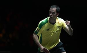 (240930) -- BEIJING, 30 septiembre, 2025 (Xinhua) -- Hugo Calderano, de Brasil, festeja después de ganar el partido de dieciseisavos de final de individuales masculinos ante Simon Gauzy, de Francia, en el China Smash del World Table Tennis (WTT) 2025, en Beijing, China, el 30 de septiembre de 2025. (Xinhua/Sun Fei) (oa) (ah) (vf)