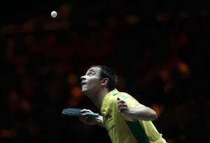 (240930) -- BEIJING, 30 septiembre, 2025 (Xinhua) -- Hugo Calderano, de Brasil, sirve la pelota durante el partido de dieciseisavos de final de individuales masculinos ante Simon Gauzy, de Francia, en el China Smash del World Table Tennis (WTT) 2025, en Beijing, China, el 30 de septiembre de 2025. (Xinhua/Sun Fei) (oa) (ah) (vf)