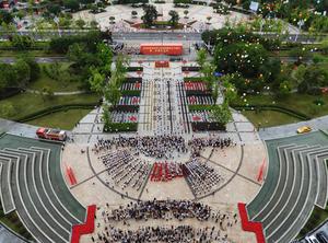 (251001) -- BEIJING, 1 octubre, 2025 (Xinhua) --Imagen del 1 de octubre de 2025 de una ceremonia de izamiento de la bandera nacional en una plaza, en la ciudad de Dazhou, en la provincia de Sichuan, en el suroeste de China. El 76º aniversario de la fundación de la República Popular China se celebró el miércoles de diversas maneras en todo el país. (Xinhua/Deng Liangkui) (ah) (ce)