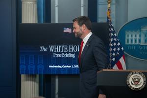 (251001) -- WASHINGTON, 1 octubre, 2025 (Xinhua) -- El vicepresidente de Estados Unidos, JD Vance (i), sale de la sala de prensa después de hablar con los reporteros, en la Casa Blanca, en Washington, D.C., Estados Unidos, el 1 de octubre de 2025. Vance advirtió el miércoles que un cierre prolongado del Gobierno federal conducirá a despidos y culpó a los demócratas por el actual estancamiento. (Xinhua/Hu Yousong) (ah) (ce)