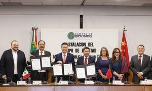 (251001) -- CIUDAD DE MEXICO, 1 octubre, 2025 (Xinhua) -- Imagen del 30 de septiembre de 2025 del presidente del Grupo de Amistad México-República Popular China, Raymundo Vázquez (4-d), y el embajador de China en México, Chen Daojiang (3-i), participando durante la instalación del Grupo de Amistad México-República Popular China de la Cámara de Diputados, en la Ciudad de México, capital de México. La LXVI Legislatura de la Cámara de Diputados de México instaló el martes el Grupo de Amistad México-República Popular China, el cual busca fomentar la cooperación y el intercambio entre ambos países, así como fortalecer sus relaciones bilaterales y lazos de diversa índole. (Xinhua/Francisco Cañedo) (fc) (jg) (ra) (ce)