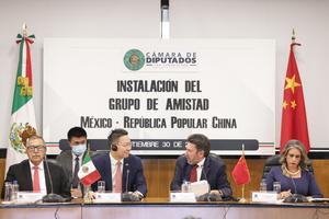 (251001) -- CIUDAD DE MEXICO, 1 octubre, 2025 (Xinhua) -- Imagen del 30 de septiembre de 2025 del presidente del Grupo de Amistad México-República Popular China, Raymundo Vázquez (2-d), conversando con el embajador de China en México, Chen Daojiang (2-i-frente), durante la instalación del Grupo de Amistad México-República Popular China de la Cámara de Diputados, en la Ciudad de México, capital de México. La LXVI Legislatura de la Cámara de Diputados de México instaló el martes el Grupo de Amistad México-República Popular China, el cual busca fomentar la cooperación y el intercambio entre ambos países, así como fortalecer sus relaciones bilaterales y lazos de diversa índole. (Xinhua/Francisco Cañedo) (fc) (jg) (ra) (ce)
