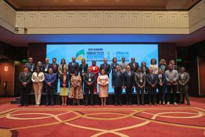 (251001) — LIMA, 1 octubre, 2025 (Xinhua) — Imagen proveída por la Presidencia de Perú de la presidenta peruana, Dina Boluarte (c-frente), posando con los asistentes durante la ceremonia de inauguración de la XXIV Reunión del Foro de Ministras y Ministros de Medio Ambiente de América Latina y el Caribe, en Lima, Perú, el 1 de octubre de 2025. Boluarte inauguró el miércoles en la ciudad de Lima, la XXIV Reunión del Foro de Ministras y Ministros de Medio Ambiente de América Latina y el Caribe, donde aseguró que el foro representa un “llamado de urgencia” para cuidar la Amazonia. (Xinhua/Presidencia de Perú) (ah) (ce)