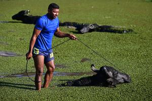 (251002) -- ISLA DE MARAJO, 2 octubre, 2025 (Xinhua) -- Imagen del 1 de octubre de 2025 de un hombre parado en el lomo de un búfalo de agua, en la Isla de Marajó, Brasil. (Xinhua/Lucio Tavora) (lt) (rtg) (ra) (ce)