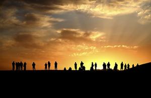 (251002) -- BEIJING, 2 octubre, 2025 (Xinhua) -- Turistas disfrutan el amanecer sobre el desierto en el área escénica de la Montaña Mingsha y el Manantial de la Luna Creciente, en la ciudad de Dunhuang, en la provincia de Gansu, en el noroeste de China, el 2 de octubre de 2025. Con el Festival de Medio Otoño de China coincidiendo este año con el Día Nacional, las personas pasan su tiempo libre de diferentes maneras durante las vacaciones de ocho días de duración. (Xinhua/Zhang Xiaoliang) (rtg) (ra) (ce)