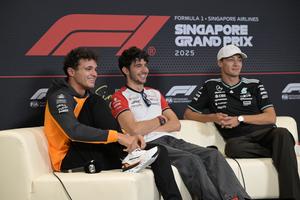 (251002) -- SINGAPUR, 2 octubre, 2025 (Xinhua) -- El piloto británico de la escudería McLaren, Lando Norris (i), el piloto francés de la escudería Haas, Esteban Ocon (c), y el piloto británico de la escudería Mercedes, George Russell, asisten a la conferencia de prensa previa a la carrera del Gran Premio de Singapur 2025 de Fórmula 1, en Singapur, el 2 de octubre de 2025. (Xinhua/Then Chih Wey) (rtg) (ra) (vf)