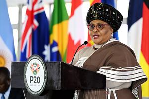 (251002) -- CIUDAD DEL CABO, 2 octubre, 2025 (Xinhua) -- Imagen del 1 de octubre de 2025 de la presidenta de la Asamblea Nacional de Sudáfrica, Thoko Didiza, hablando en la ceremonia de inauguración de la XI Cumbre de Presidentes de los Parlamentos del Grupo de los Veinte (G20), en Kleinmond, en la provincia del Cabo Occidental, Sudáfrica. La XI Cumbre de Presidentes de los Parlamentos del G20 se inauguró el miércoles en la provincia del Cabo Occidental de Sudáfrica, colocando la diplomacia parlamentaria en el centro de las discusiones. (Xinhua/Xabiso Mkhabela) (jg) (ah) (vf)