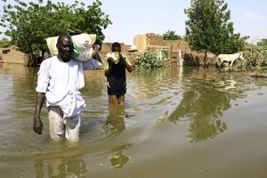 (251002) -- BAHRI, 2 octubre, 2025 (Xinhua) -- Imagen del 1 de octubre de 2025 de residentes vadeando a través del agua de la inundación después de que el río Nilo inundó su aldea, en la ciudad de Bahri, en el norte de Jartum, Sudán. El ministro de Agricultura e Irrigación de Sudán instó el miércoles a todos los ciudadanos que viven a lo largo de las orillas del río Nilo a tomar las precauciones necesarias para proteger sus vidas y propiedades, ya que los niveles del río están aumentando hasta el nivel de inundación en varios estados. (Xinhua/Mohamed Khidir) (rtg) (ra) (vf)
