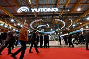 (251005) -- BRUSELAS, 5 octubre, 2025 (Xinhua) -- Imagen el 4 de octubre de 2025 de visitantes caminando frente al estand de Yutong durante el Busworld Europe, en Bruselas, Bélgica. La 27 edición del Busworld Europe se celebra en el Brussels Expo, en Bélgica, del 4 al 9 de octubre de 2025. Como la feria comercial bienal líder a nivel mundial para la industria de autocares y autobuses, Busworld da la bienvenida a expositores y profesionales de todo el mundo para mostrar los últimos vehículos, tecnologías e innovaciones. (Xinhua/Lyu You) (oa) (ah)