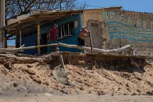 (251005) -- ATAFONA, 5 octubre, 2025 (Xinhua) -- Imagen del 4 de octubre de 2025 de dos residentes permaneciendo frente a una casa erosionada por olas de mar, en Atafona, estado de Río de Janeiro, Brasil. En los últimos años, Atafona, una ciudad costera en el norte del estado de Río de Janeiro, ha sido absorbida gradualmente por el mar debido a la grave erosión costera, con el derrumbe de viviendas y la reubicación forzada de sus residentes. Mientras Brasil se prepara para albergar la 30ª Conferencia de las Partes (COP30) de Naciones Unidas sobre Cambio Climático, programada para este noviembre en Belém, la situación en Atafona es un vívido recordatorio del profundo impacto del cambio climático y el aumento del nivel del mar en las comunidades costeras de todo el mundo. (Xinhua/Wang Tiancong) (rtg) (ah)