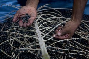 (251003) -- ISLA DE MARAJO, 3 octubre, 2025 (Xinhua) -- Imagen del 2 de octubre de 2025 de un trabajador mostrando frutos de acaí en una finca, en la Isla de Marajó, en el estado de Pará, Brasil. (Xinhua/Lucio Tavora) (lt) (jg) (rtg) (vf)