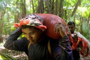 (251003) — ISLA DE MARAJO, 3 octubre, 2025 (Xinhua) — Imagen del 2 de octubre de 2025 de un trabajador transportando un saco de frutos de acaí en una finca, en la Isla de Marajó, en el estado de Pará, Brasil. (Xinhua/Lucio Tavora) (lt) (jg) (rtg) (vf)