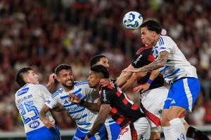 (251003) — RIO DE JANEIRO, 3 octubre, 2025 (Xinhua) — Imagen del 2 de octubre de 2025 del jugador, Kaio Jorge (d), de Cruzeiro, cabeceando el balón durante el partido correspondiente a la jornada 26 del Campeonato Brasileño Serie A ante Flamengo, celebrado en el Estadio Maracaná, en Río de Janeiro, Brasil. (Xinhua/Claudia Martini) (cm) (jg) (rtg) (ce)