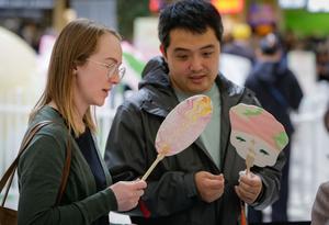 (251005) -- RICHMOND, 5 octubre, 2025 (Xinhua) -- Imagen del 4 de octubre de 2025 de personas participando en un taller de fabricación de abanicos durante la celebración del Festival del Medio Otoño en un centro comercial, en Richmond, Columbia Británica, Canadá. (Xinhua/Liang Sen) (oa) (ah)