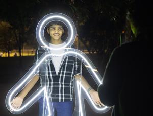 (251005) -- TORONTO, 5 octubre, 2025 (Xinhua) -- Imagen del 4 de octubre de 2025 de un hombre posando para fotografías con la instalación artística "Signals of the City: Crossing Paths" durante el evento Nuit Blanche 2025, en Toronto, Canadá. El festival anual de arte, que dura toda la noche, comenzó aquí el sábado y exhibe más de 85 obras de arte contemporáneo de artistas locales, nacionales e internacionales en espacios públicos. (Xinhua/Zou Zheng) (oa) (ah)