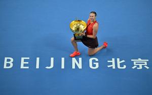 (251005) -- BEIJING, 5 octubre, 2025 (Xinhua) -- Amanda Anisimova reacciona durante la ceremonia de premiación al término del partido final de individuales femeninos entre Amanda Anisimova, de Estados Unidos, y Linda Noskova, de República Checa, en el torneo de tenis China Open 2025, en Beijing, China, el 5 de octubre de 2025. (Xinhua/Hu Jingwen) (rtg) (ah)