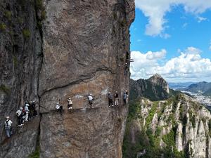 (251004) -- BEIJING, 4 octubre, 2025 (Xinhua) -- Imagen tomada con un dron el 4 de octubre de 2025 de turistas experimentando la Vía Ferrata, una forma de escalada asistida mediante cables de acero y puntos de apoyo anclados en las paredes de los acantilados, en un punto escénico en Yueqing de la provincia de Zhejiang, en el este de China. Los destinos turísticos de toda China están experimentando un aumento en el número de visitantes desde el miércoles con el comienzo de las vacaciones de ocho días por el Día Nacional y el Festival de Medio Otoño. (Xinhua/Cai Kuanyuan) (jg) (rtg) (ce)