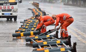(251005) -- HAIKOU, 5 octubre, 2025 (Xinhua) -- Empleados remueven divisores de carriles empujados por los fuertes vientos en una calle, en Haikou, en la provincia de Hainan, en el sur de China, el 5 de octubre de 2025. El tifón Matmo, la tormenta número 21 de la temporada de tifones del Pacífico 2025 a la que se asigna un nombre, se está intensificando mientras se acerca a las zonas costeras del sur de China, lo que ha provocado evacuaciones a gran escala. La provincia insular de Hainan había reubicado hasta el mediodía del domingo a más de 197.000 personas desde zonas de alto riesgo, manteniendo la alerta roja por tifón. (Xinhua/Guo Cheng) (rtg) (ah)