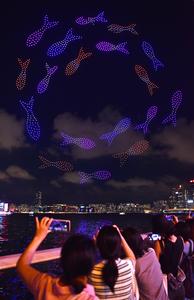 (251002) -- HONG KONG, 2 octubre, 2025 (Xinhua) -- Un espectáculo de luces con drones es presentado en celebración del 76º aniversario de la fundación de la República Popular China, en Hong Kong, en el sur de China, el 2 de octubre de 2025. (Xinhua/Chen Duo) (rtg) (ra) (vf)
