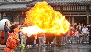 (251005) -- LUOYANG, 5 octubre, 2025 (Xinhua) -- Un artista folklórico realiza una presentación para los turistas en un punto escénico de una antigua calle, en el distrito de Luolong de Luoyang, en la provincia de Henan, en el centro de China, el 5 de octubre de 2025. Los destinos turísticos de toda China están experimentando un aumento en el número de visitantes desde que el miércoles comenzó el feriado de ocho días por el Día Nacional y el Festival del Medio Otoño. (Xinhua/Huang Zhengwei) (oa) (ah)
