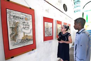 (251003) -- LA HABANA, 3 octubre, 2025 (Xinhua) -- Imagen del 2 de octubre de 2025 de la pintora cubana, Mery González (i), y el pintor y calígrafo, Alexis González (d), observando la muestra "Raíces en la tierra ajena" en la Casa de las Artes y Tradiciones Chinas, en el Barrio Chino de La Habana, capital de Cuba. La Casa de las Artes y Tradiciones Chinas, principal institución del Barrio Chino habanero, acogió la muestra "Raíces en la tierra ajena" con la que la artista, la pintora cubana, Mery González, rindió homenaje a la herencia asiática. (Xinhua/Joaquín Hernández) (jh) (oa) (ra) (vf)