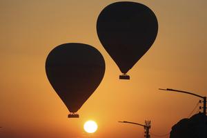 (251004) -- LUXOR, 4 octubre, 2025 (Xinhua) -- Globos aerostáticos son vistos durante el amanecer sobre la ribera occidental del río Nilo, en Luxor, Egipto, el 4 de octubre de 2025. Luxor, capital del antiguo Alto Egipto conocida como Tebas, es un destino turístico famoso por sus edificios históricos del templo y otras reliquias. Hoy en día los viajes en globo aerostático son una opción popular para los turistas que visitan Luxor. (Xinhua/Ahmed Gomaa) (oa) (ra) (ce)