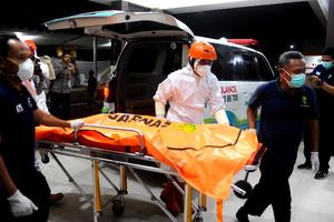 (251005) -- SIDOARJO, 5 octubre, 2025 (Xinhua) -- Imagen del 4 de octubre de 2025 de trabajadores transfiriendo una bolsa de cadáveres con una víctima en el sitio del colapso de un edificio escolar, en el Hospital Bhayangkara, en Surabaya, en Java Oriental, Indonesia. El número de muertos por el derrumbe de un edificio escolar en la provincia indonesia de Java Oriental se ha elevado a 37, informaron el domingo las autoridades de rescate regionales. (Xinhua/Sahlan Kurniawan) (rtg) (ah)