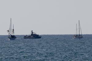 (251003) -- ASHDOD, 3 octubre, 2025 (Xinhua) -- Imagen del 2 de octubre de 2025 de embarcaciones de la Flotilla Global Sumud (GSF, por sus siglas en inglés) con destino a Gaza siendo remolcadas hacia el puerto de Ashdod, en el sur de Israel. La Armada israelí interceptó el viernes la última embarcación de la GSF con destino a Gaza en el mar Mediterráneo, según informó el canal estatal israelí Kan TV News. (Xinhua/Jamal Awad) (oa) (ra) (vf)