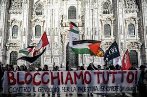 (251003) -- MILAN, 3 octubre, 2025 (Xinhua) -- Imagen del 1 de octubre de 2025 de manifestantes reuniéndose para una protesta frente a la Catedral de Milán, en Milán, Italia. La intercepción por parte de Israel de una flotilla internacional transportando ayuda humanitaria a Gaza ha provocado condenas en toda Europa, y los Gobiernos instan a Israel a garantizar la seguridad de sus ciudadanos a bordo de los barcos con destino a Gaza. (Xinhua/Str) (jg) (rtg) (ce)