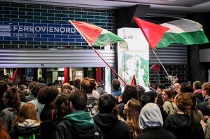 (251003) -- MILAN, 3 octubre, 2025 (Xinhua) -- Imagen del 1 de octubre de 2025 de manifestantes reuniéndose para una protesta en la Estación de Tren Cadorna, en Milán, Italia. La intercepción por parte de Israel de una flotilla internacional transportando ayuda humanitaria a Gaza ha provocado condenas en toda Europa, y los Gobiernos instan a Israel a garantizar la seguridad de sus ciudadanos a bordo de los barcos con destino a Gaza. (Xinhua/Str) (jg) (rtg) (ce)