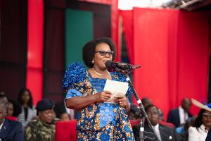 (251005) -- BLANTYRE, 5 octubre, 2025 (Xinhua) -- Imagen del 4 de octubre de 2025 de la vicepresidenta de Malaui, Jane Ansah, tomando juramento en el Estadio Kamuzu, en Blantyre, Malaui. EEl presidente Peter Mutharika, de 85 años de edad, que ya ocupó el cargo de 2014 a 2020, volvió a la presidencia con la expresidenta de la Comisión Electoral de Malaui, Jane Ansah, como vicepresidenta. (Xinhua/Joseph Mizere) (rtg) (ah)