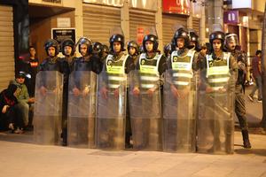 (251003) -- RABAT, 3 octubre, 2025 (Xinhua) -- Imagen del 2 de octubre de 2025 de fuerzas de seguridad montando guardia en un cruce durante una protesta para exigir mejores servicios públicos, en el centro de Rabat, Marruecos. Tres personas murieron durante las protestas lideradas por jóvenes cerca de la ciudad de Agadir, en la costa atlántica de Marruecos, según informó el jueves el Ministerio del Interior marroquí. (Xinhua/Huo Jing) (oa) (ra) (vf)