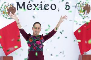 (251005) -- CIUDAD DE MEXICO, 5 octubre, 2025 (Xinhua) -- La presidenta mexicana, Claudia Sheinbaum, reacciona durante el evento "La transformación avanza", en la Ciudad de México, capital de México, el 5 de octubre de 2025. Sheinbaum celebró el domingo su primer año de Gobierno iniciado el 1 de octubre de 2024 con un mensaje público en la plaza central de la capital del país, en el que reafirmó su compromiso de defender al país y rechazó cualquier injerencia extranjera o violación del territorio mexicano. (Xinhua/Francisco Cañedo) (fc) (oa) (ah)
