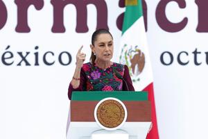 (251005) -- CIUDAD DE MEXICO, 5 octubre, 2025 (Xinhua) -- La presidenta mexicana, Claudia Sheinbaum, habla durante el evento "La transformación avanza", en la Ciudad de México, capital de México, el 5 de octubre de 2025. Sheinbaum celebró el domingo su primer año de Gobierno iniciado el 1 de octubre de 2024 con un mensaje público en la plaza central de la capital del país, en el que reafirmó su compromiso de defender al país y rechazó cualquier injerencia extranjera o violación del territorio mexicano. (Xinhua/Francisco Cañedo) (fc) (oa) (ah)