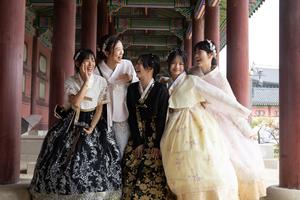 (251005) -- SEUL, 5 octubre, 2025 (Xinhua) -- Personas vestidas con el traje tradicional coreano "Hanbok" visitan el Palacio Gyeongbokgung, en Seúl, República de Corea, el 5 de octubre de 2025. Los palacios antiguos de Seúl, incluido el Palacio Gyeongbokgung, están abiertos al público de forma gratuita del 3 al 9 de octubre. (Xinhua/Jun Hyosang) (oa) (ah)