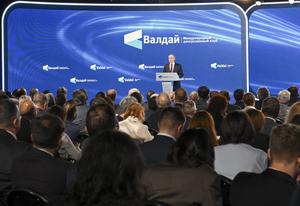 (251003) -- SOCHI, 3 octubre, 2025 (Xinhua) -- El presidente ruso, Vladimir Putin, habla en la 22ª reunión anual del Club de Debate Internacional Valdai, en Sochi, Rusia. (Xinhua/Hao Jianwei) (jg) (rtg) (vf)