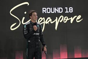 (251004) -- SINGAPUR, 4 octubre, 2025 (Xinhua) -- El piloto británico de la escudería Mercedes, George Russell, reacciona después de ganar la pole position en la sesión de clasificación del Gran Premio de Singapur 2025 de Fórmula 1, en Singapur, el 4 de octubre de 2025. (Xinhua/Then Chih Wey) (oa) (ra) (ce)