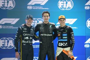 (251004) -- SINGAPUR, 4 octubre, 2025 (Xinhua) -- El piloto británico de la escudería Mercedes, George Russell (c), el piloto neerlandés de la escudería Red Bull, Max Verstappen (i), y el piloto australiano de la escudería McLaren, Oscar Piastri, posan para una fotografía al término de la sesión de clasificación del Gran Premio de Singapur 2025 de Fórmula 1, en Singapur, el 4 de octubre de 2025. (Xinhua/Then Chih Wey) (oa) (ra) (ce)