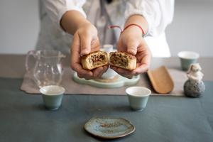 (251006) -- BUENOS AIRES, 6 octubre, 2025 (Xinhua) -- Imagen del 3 de octubre de 2025 de la experta en té, Carolina Chiu, mostrando un pastel de luna de cinco frutos secos durante el taller de ceremonia de té de China, en la ciudad de Buenos Aires, capital de Argentina. Un sabroso té y tradicionales pasteles de luna se convirtieron en los protagonistas de un ameno taller de ceremonia de té de China, organizado para celebrar el Festival del Medio Otoño en la capital de Argentina, Buenos Aires. (Xinhua/Martín Zabala) (mz) (oa) (ah) (vf)