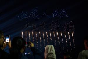 (251006) -- BEIJING, 6 octubre, 2025 (Xinhua) -- Personas toman fotografías de un espectáculo de luces con drones, en Harbin, en la provincia de Heilongjiang, en el noreste de China, el 6 de octubre de 2025. Personas participaron en diversos eventos culturales folclóricos tradicionales el lunes para celebrar el Festival del Medio Otoño. (Xinhua/Zhang Tao) (oa) (ah) (vf)